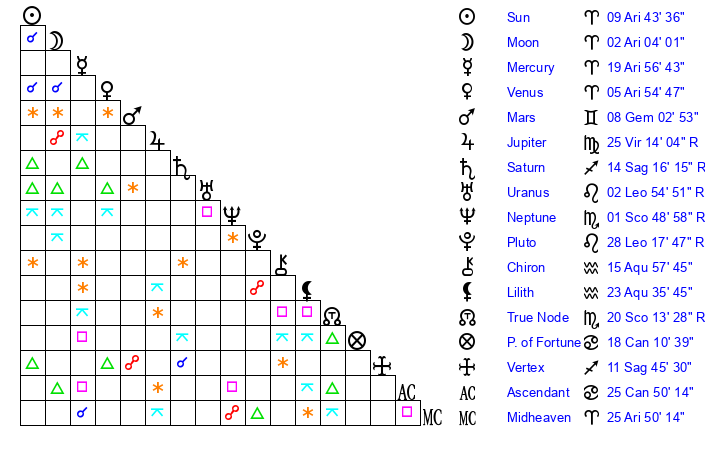 | Sun | 9 Aries 43 | 10 Aries 14 | 15 Gemini 42 |