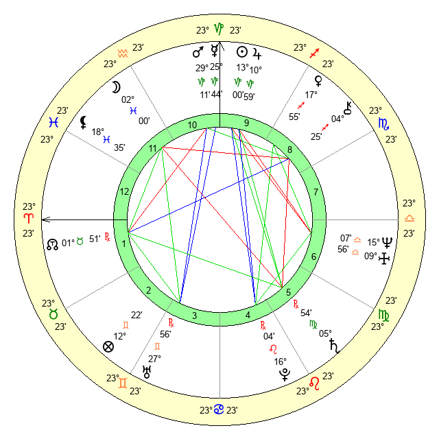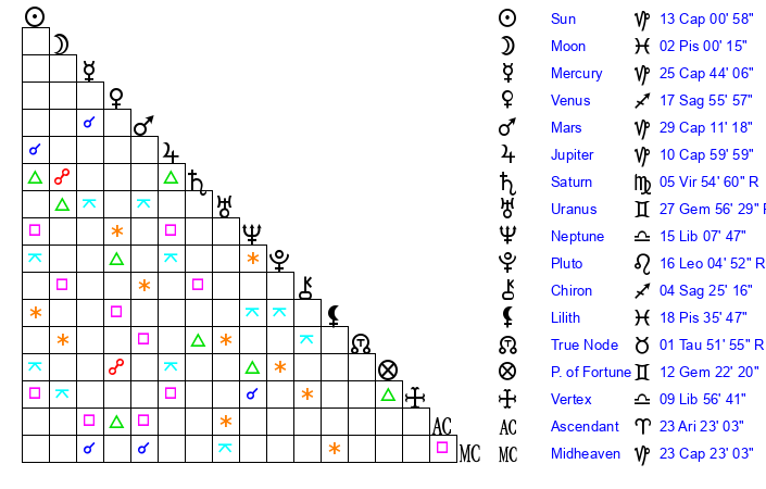 | Saturn | 6 Virgo 26 | 26 Pisces 14 | 1 Virgo 14 |