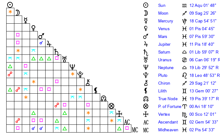| Venus | 1 Pisces 5 | 28 Pisces 0 | 1 Gemini 36 |