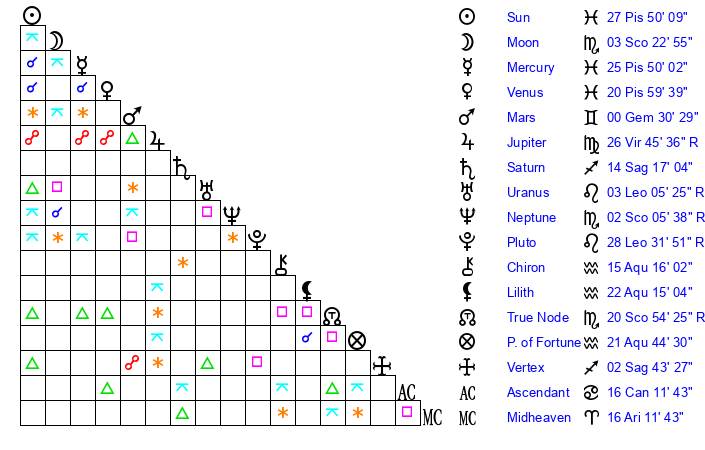 | Neptune | 2 Scorpio 5 | 29 Pisces 33 | 0 Scorpio 21 |