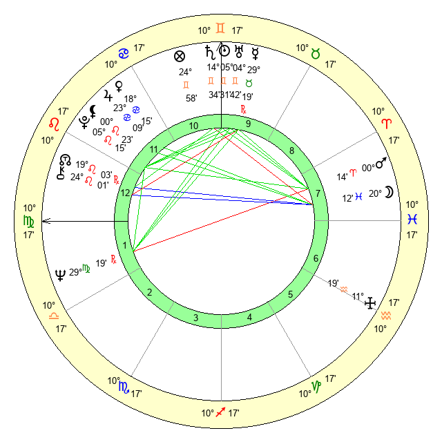 | Sun | 5 Gemini 31 | 6 Gemini 39 | 23 Leo 54 |