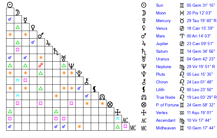 | Moon | 20 Pisces 11 | 14 Gemini 53 | 20 Pisces 27 |