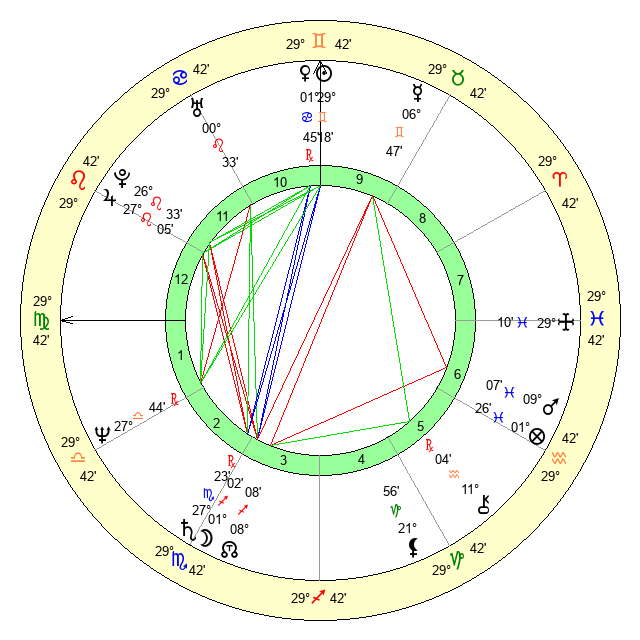 | Sun | 29 Gemini 18 | 29 Gemini 37 | 5 Virgo 20 |