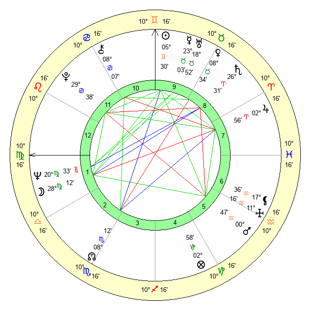 | Moon | 28 Virgo 16 | 14 Gemini 53 | 25 Scorpio 39 |