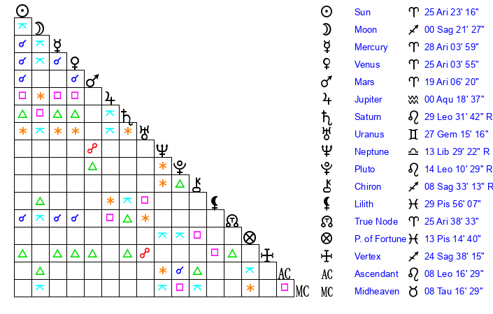 | Mars | 19 Aries 7 | 29 Cancer 0 | 14 Gemini 34 |