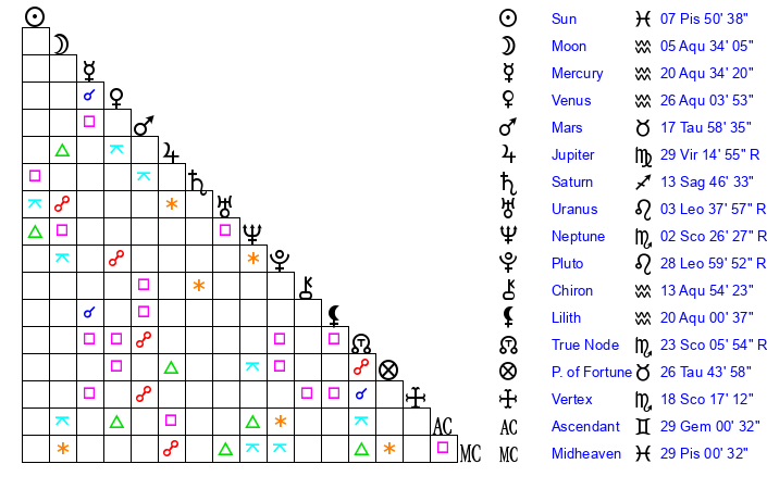 | Mercury | 20 Aquarius 34 | 22 Pisces 24 | 15 Taurus 25 |
