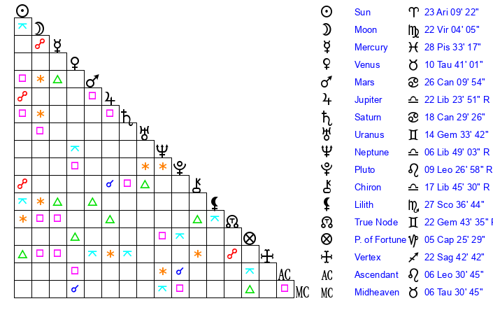 | Jupiter | 22 Libra 13 | 18 Gemini 6 | 17 Libra 44 |