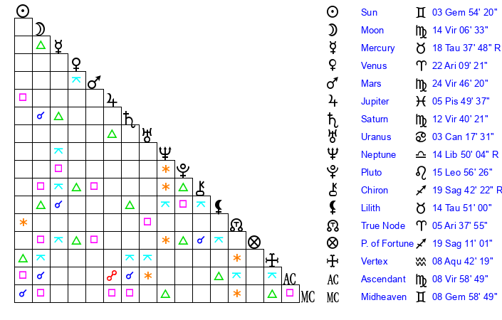 | Moon | 14 Virgo 7 | 14 Taurus 43 | 17 Gemini 1 |
