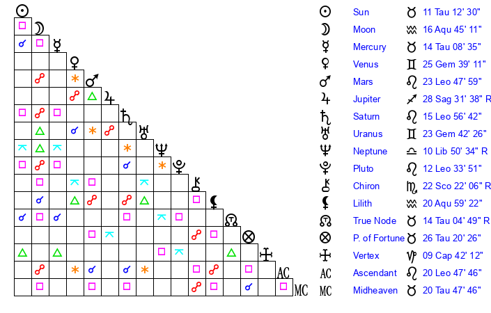 | Saturn | 16 Leo 25 | 27 Pisces 50 | 22 Leo 32 |