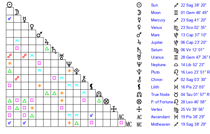 | Sun | 22 Sagittarius 38 | 22 Sagittarius 57 | 10 Pisces 47 |