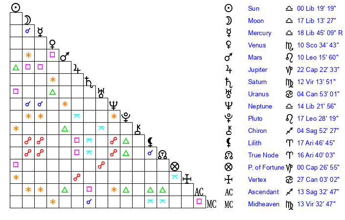 | Neptune | 14 Libra 22 | 0 Aries 44 | 16 Libra 53 |