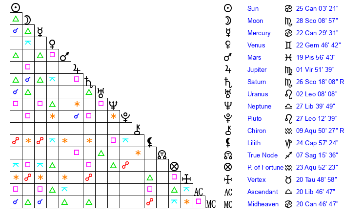 | Moon | 28 Scorpio 12 | 21 Aries 6 | 26 Taurus 20 |
