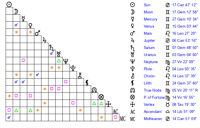 | Sun | 17 Cancer 47 | 18 Cancer 41 | 7 Libra 53 |