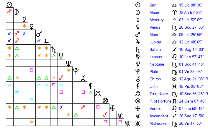 | Moon | 13 Aries 4 | 7 Taurus 11 | 12 Libra 40 |