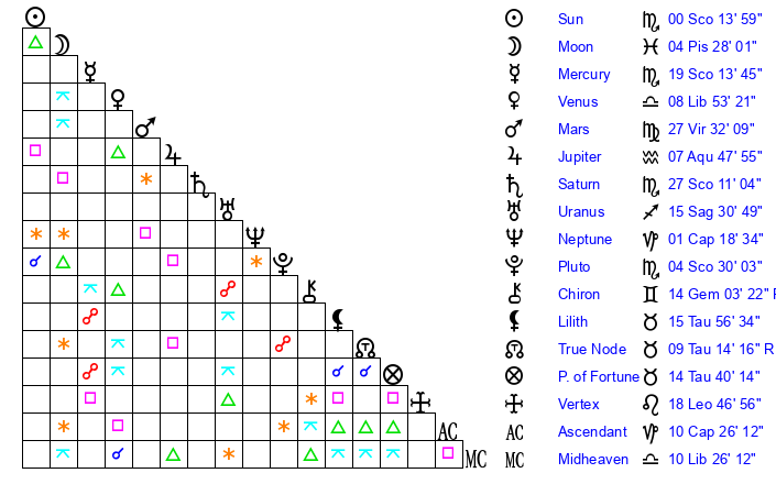 | Sun | 0 Scorpio 14 | 0 Scorpio 32 | 10 Sagittarius 28 |