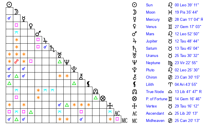 | Moon | 19 Pisces 35 | 16 Cancer 48 | 27 Aries 10 |