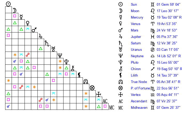 | Sun | 1 Gemini 59 | 2 Gemini 49 | 13 Leo 38 |