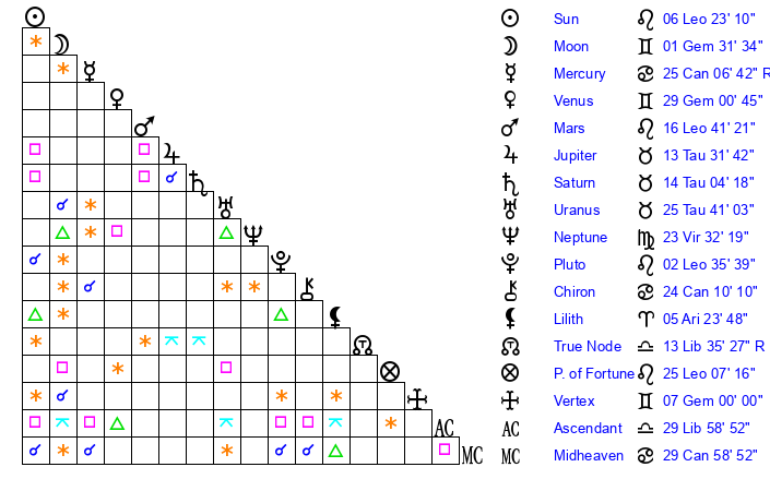 | Venus | 29 Gemini 0 | 28 Gemini 19 | 18 Virgo 10 |