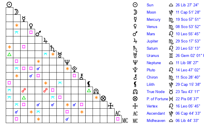 | Sun | 26 Libra 28 | 27 Libra 33 | 15 Capricorn 18 |