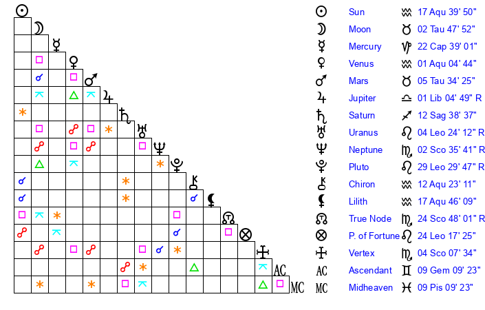 | Sun | 17 Aquarius 39 | 18 Aquarius 9 | 25 Aries 27 |