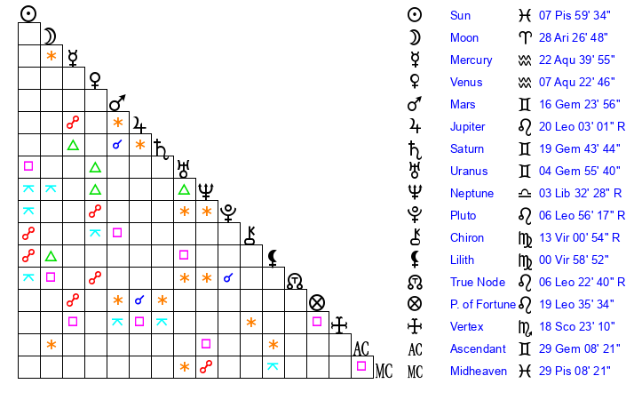 | Sun | 8 Pisces 0 | 9 Pisces 21 | 27 Taurus 36 |