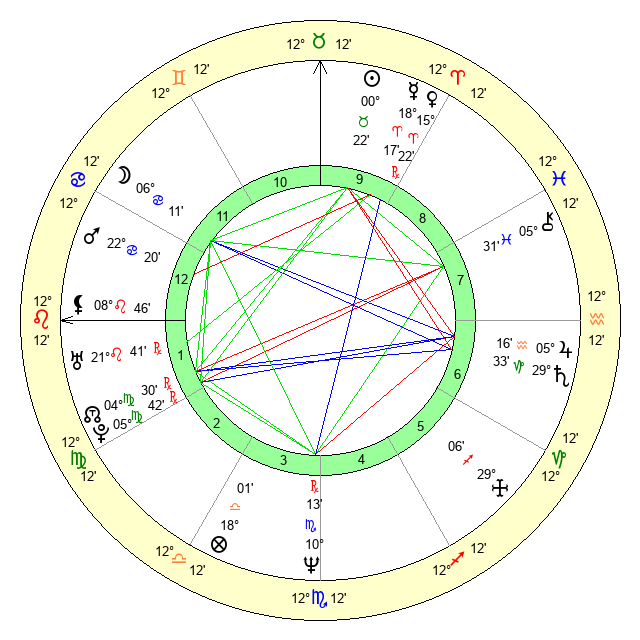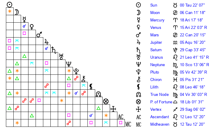 | Sun | 0 Taurus 22 | 0 Taurus 52 | 1 Cancer 58 |