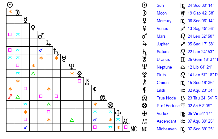 | Sun | 24 Scorpio 30 | 25 Scorpio 36 | 13 Aquarius 47 |