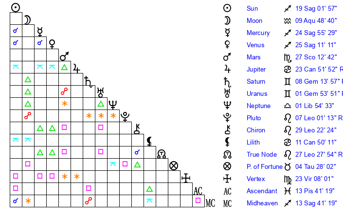 | Sun | 19 Sagittarius 2 | 19 Sagittarius 54 | 13 Pisces 15 |