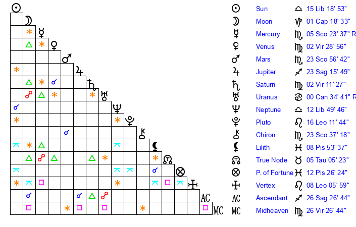 | Sun | 15 Libra 19 | 15 Libra 40 | 2 Capricorn 49 |