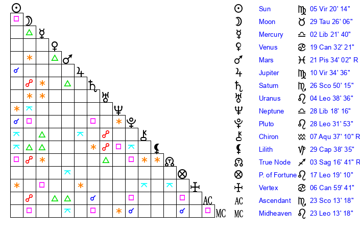 | Sun | 5 Virgo 20 | 5 Virgo 38 | 13 Scorpio 15 |