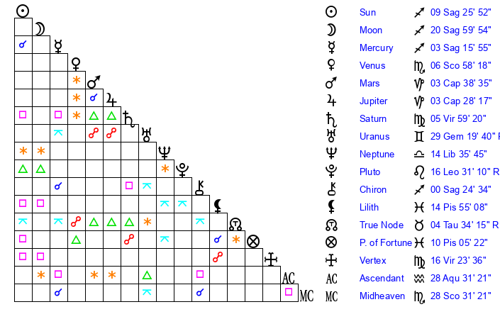 | Venus | 6 Scorpio 58 | 1 Sagittarius 5 | 12 Aquarius 54 |