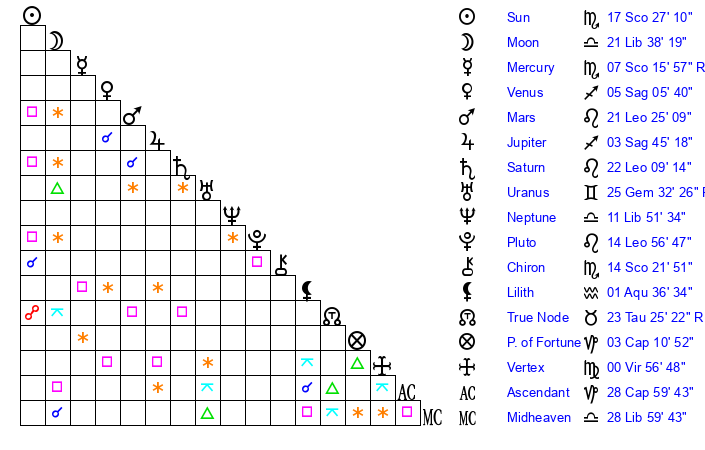 | Sun | 17 Scorpio 27 | 18 Scorpio 33 | 6 Aquarius 41 |