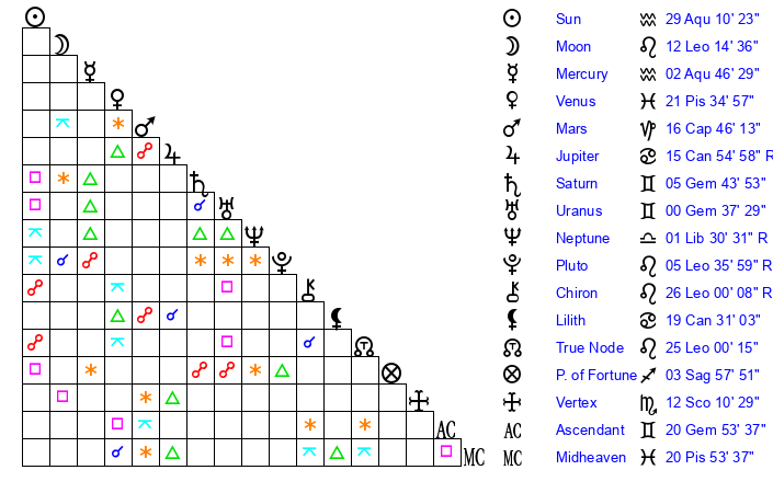 | Moon | 12 Leo 16 | 8 Scorpio 3 | 12 Leo 22 |