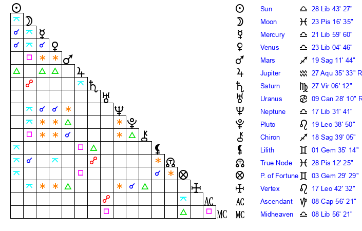 | Neptune | 17 Libra 31 | 29 Pisces 59 | 19 Libra 28 |