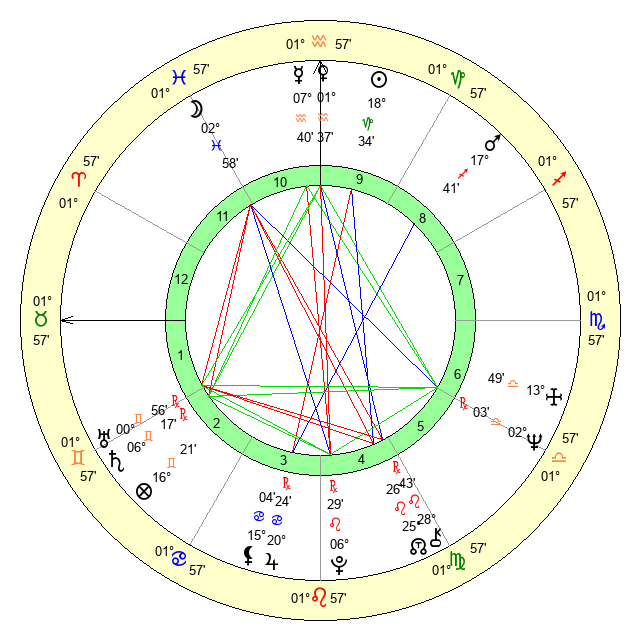 | Moon | 2 Pisces 50 | 25 Taurus 21 | 29 Aquarius 13 |