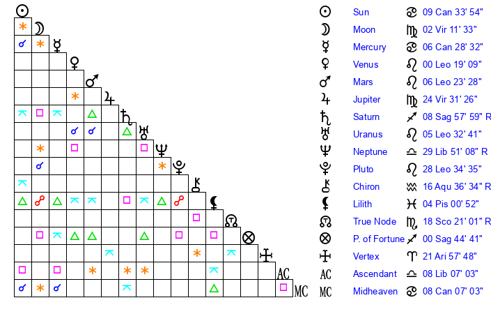 | Moon | 2 Virgo 12 | 27 Virgo 56 | 28 Aquarius 28 |