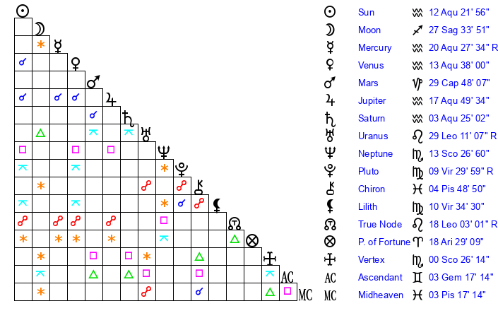 | Moon | 27 Sagittarius 34 | 25 Pisces 0 | 27 Aries 56 |