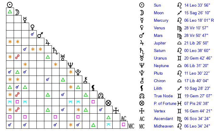 | Pluto | 11 Leo 30 | 2 Aquarius 15 | 13 Leo 16 |