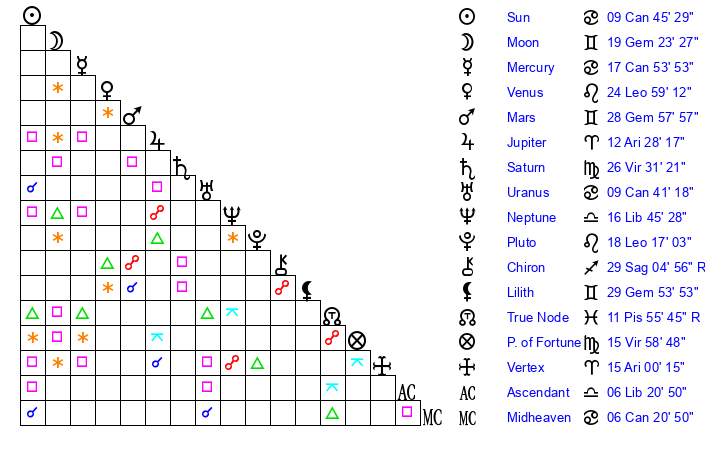 | Sun | 9 Cancer 45 | 10 Cancer 49 | 20 Virgo 49 |