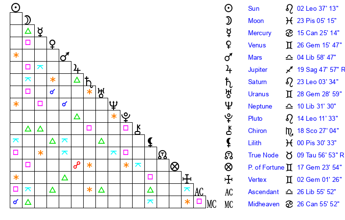 | Moon | 23 Pisces 4 | 14 Leo 26 | 26 Capricorn 16 |