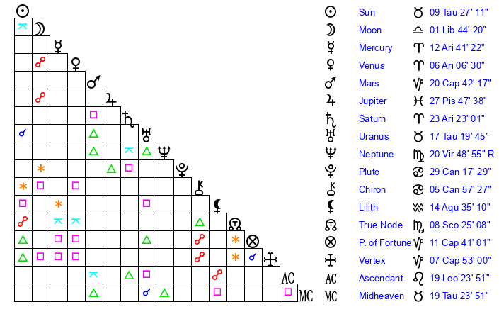 | Moon | 1 Libra 48 | 21 Gemini 21 | 28 Scorpio 52 |