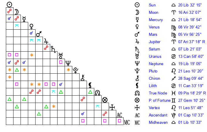 | Neptune | 19 Libra 19 | 0 Aries 10 | 21 Libra 30 |