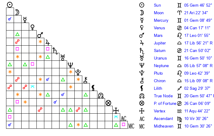 | Sun | 5 Gemini 47 | 6 Gemini 39 | 21 Leo 17 |