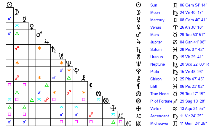 | Moon | 24 Virgo 45 | 29 Gemini 42 | 27 Scorpio 13 |
