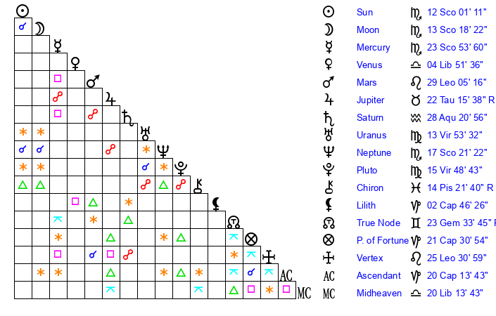 | Moon | 13 Scorpio 13 | 26 Aries 3 | 0 Aquarius 29 |