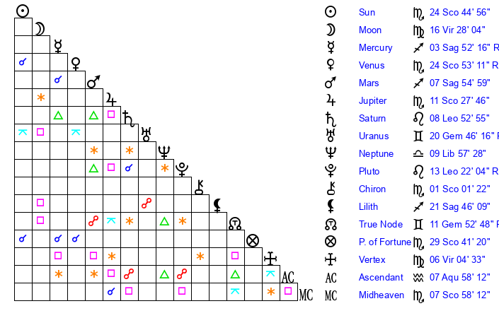 | Venus | 24 Scorpio 53 | 13 Scorpio 30 | 28 Sagittarius 23 |