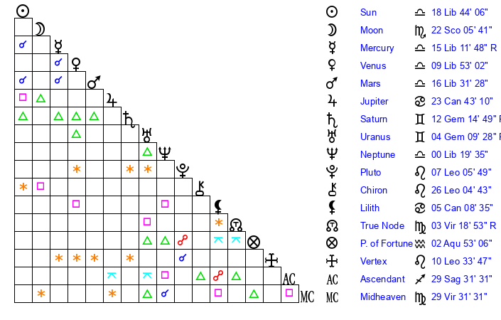 | Sun | 18 Libra 44 | 19 Libra 37 | 12 Capricorn 27 |