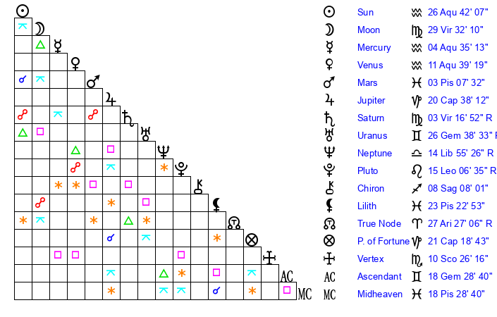| Sun | 26 Aquarius 42 | 27 Aquarius 16 | 11 Taurus 57 |