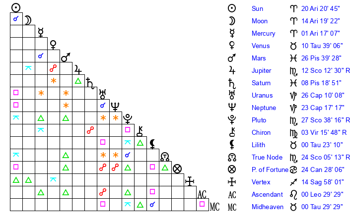 | Moon | 14 Aries 13 | 22 Virgo 49 | 28 Taurus 40 |