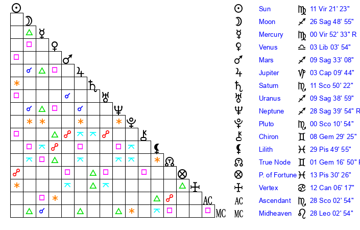 | Saturn | 12 Scorpio 9 | 29 Pisces 42 | 16 Scorpio 8 |